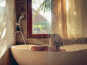 Middle,Aged,Woman,Taking,A,Bath,In,A,Bathroom,With
