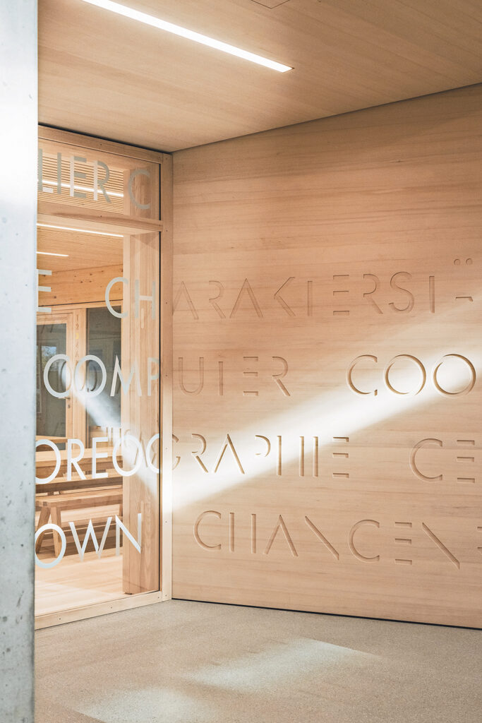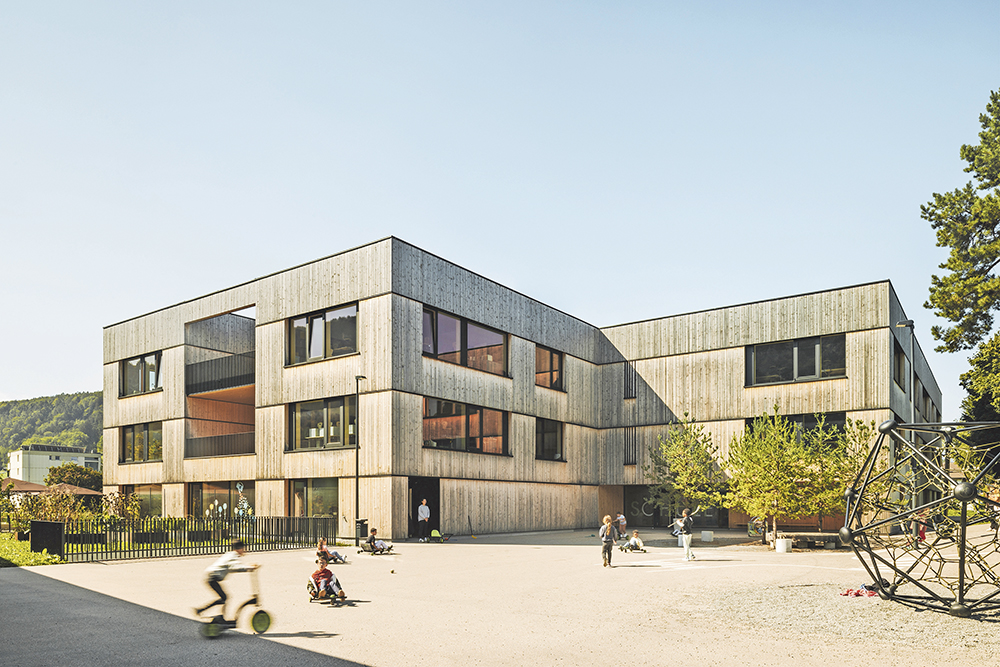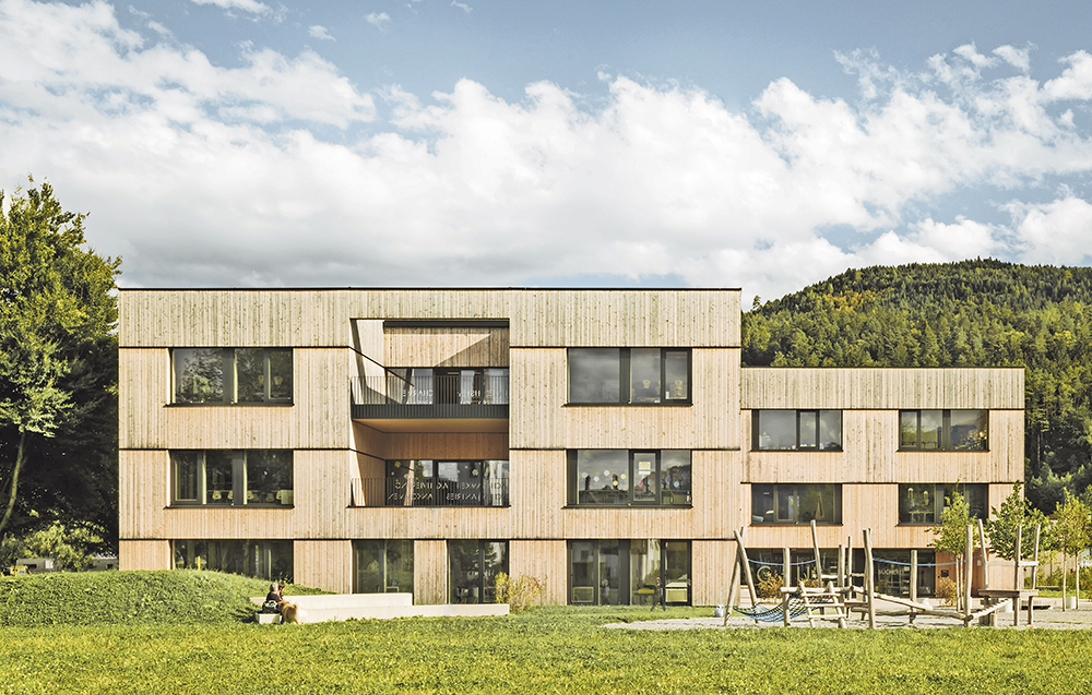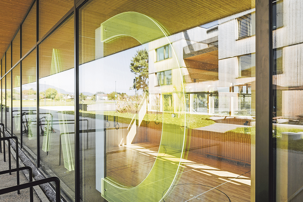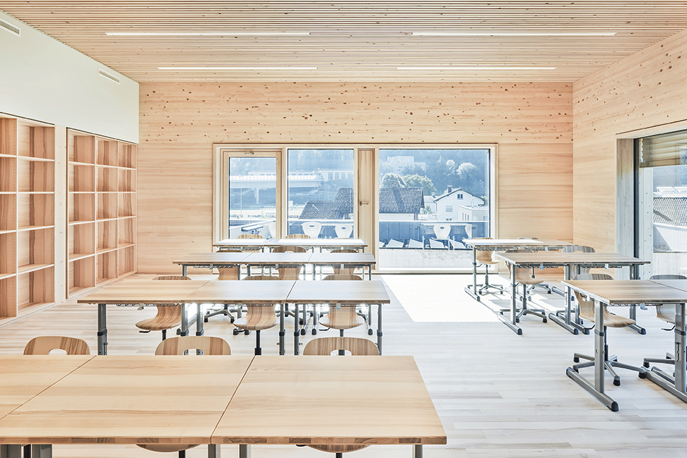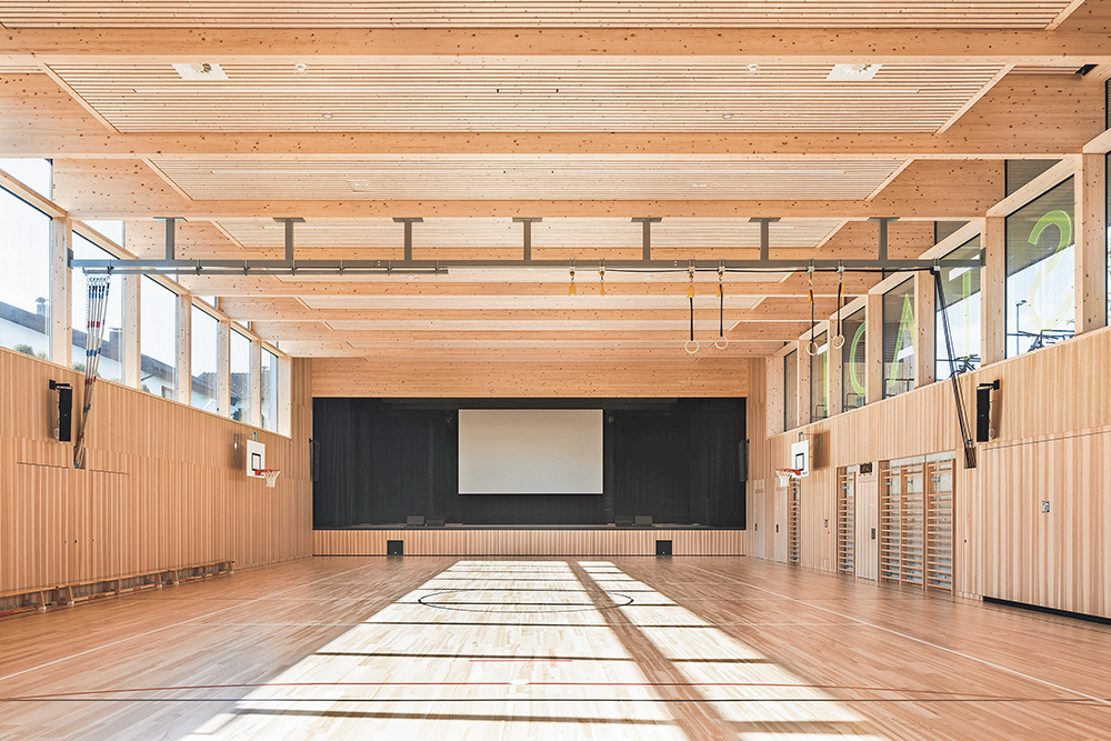 Alle Funktionen in einem Gebäude wäre an diesem Ort ein enormer Maßstabssprung gewesen“, erklärt Paul Steurer vom Architekturbüro querformat. Die Schule ist als konstruktiver, vorgefertigter Holzbau ausgeführt und fügt sich in ihrem Maßstab und der vertikalen Lamellenfassade sehr gut in die umgebende Einfamilienhausstruktur. Den geforderten Turnsaal mit Vereinshaus haben die Architekten zu einem langen, kompakten, eingeschoßigen Gebäude zusammengefasst, das nun leicht schräg östlich der Schule steht und so den nordöstlichen Schulhof zum veritablen öffentlichen Raum adelt. „Fast jeden Abend ist hier ein Sport-, Musik- oder sonstiger Verein aktiv “, sagt Steurer. Auch Bälle und Veranstaltungen finden statt. Das Gebäude ist unterirdisch mit der Schule verbunden, aber separat zugänglich. Es gibt ein neues Probelokal für den Musikverein Altenstadt sowie Unterrichtsräume für die städtische Musikschule, ein großes Foyer, und eine kleine Küche. Das Vereinshaus öffnet sich mit einer durchgehenden Glasfassade und einem großen Vordach zum Platz.