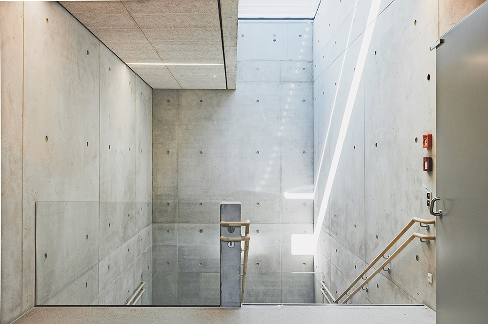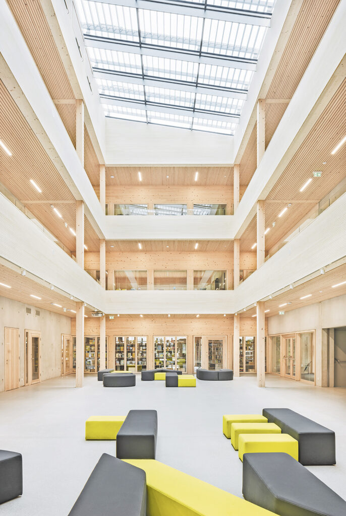 Die Volksschule darf also nun einfach Volksschule sein und sie tut das als phänomenales, dreigeschoßiges Punkthaus, das sich so selbstverständlich erschließt, wie es sich nur bei einem gründlich durchdachten Entwurf einstellt. Dieser entwickelt sich aus der Idee mit den zwei Eingängen. Deren Foyers münden in eine haushohe Aula, die von einem Oberlicht natürlich erhellt wird. Um ihren großen, durchgehenden Luftraum verläuft in jeder Ebene ein Umgang, der alle angrenzenden Klassen-, Gruppen-, Neben-, Lehrer-, Sonderräume und auch Stiegenhäuser erschließt. Hier bewegen sich Lehrende und Kinder im Lauf des Tages mehrfach auf, ab, kreuz und quer. Sie sehen einander und können durch den Luftraum hinweg geschoß-übergreifend miteinander kommunizieren. In diesem haushohen, offenen Raum schlägt das Herz der Volksschule Altenstadt. Sie besteht aus zwölf Stammklassen, die in Clustern organisiert sind. Jede Stammklasse hat etwa 25 Schüler(innen), das macht insgesamt rund 300 Kinder.