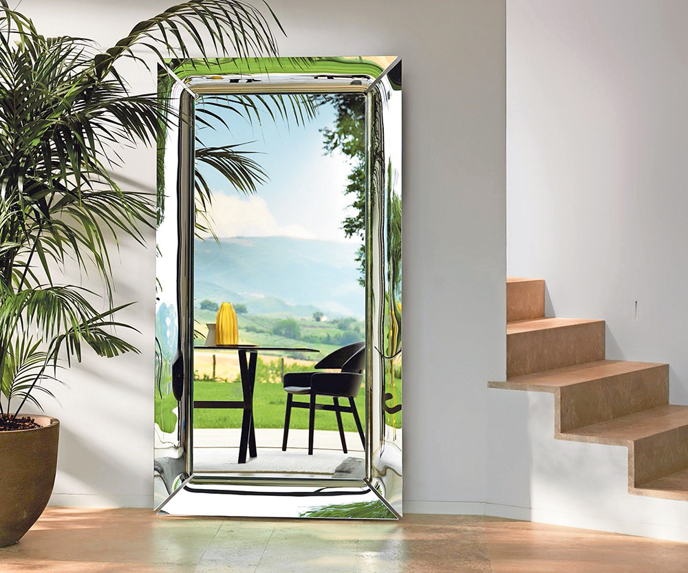 Gesehen bei ZÜCO Polsterdesign, Dornbirn. Preis wie abgebildet, 195 x 105 cm: 3312 Euro. Stand- bzw. Wandspiegel mit Rahmen aus vier einzelnen Elementen aus 6 mm starkem, gebogenem Glas, versilbert oder mit speziellen Metallfarben hinter-lackiert. Auf Wunsch mit dimmbarer LED-Hintergrundbeleuchtung.