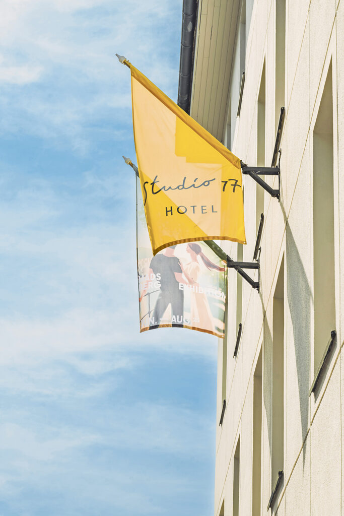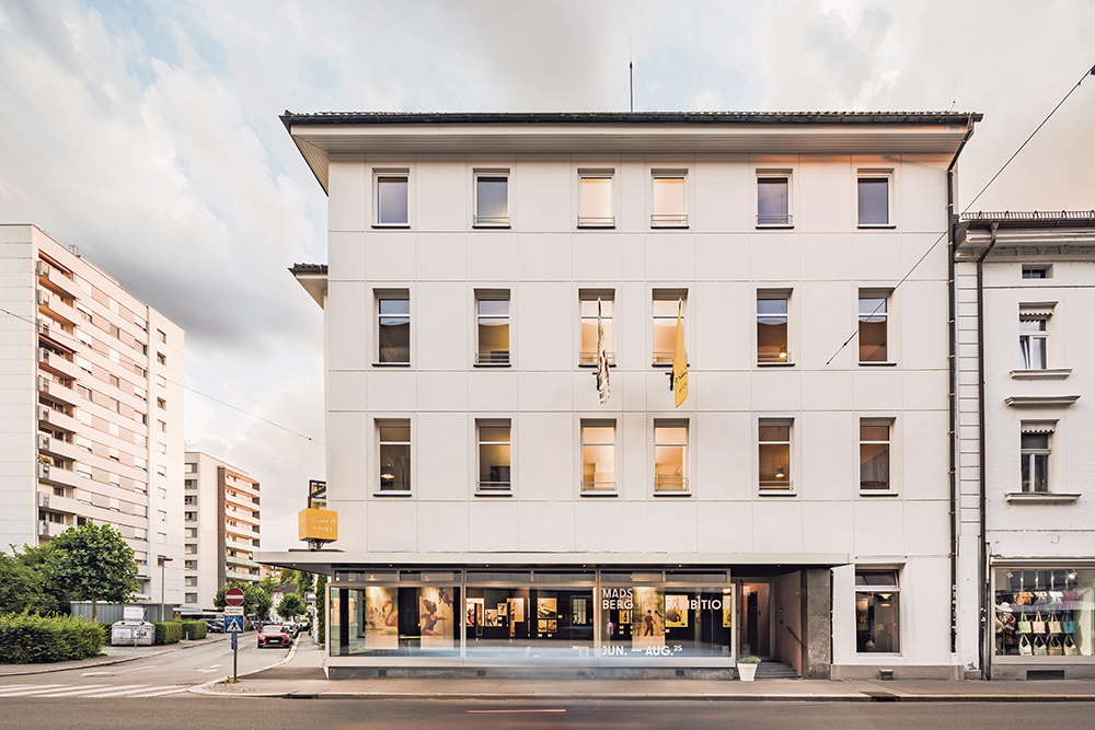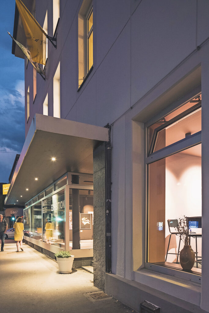Ergänzt wird das Konzept durch eine Honesty-Bar im Eingangsbereich: Getränke, Snacks und Gläser stehen bereit, abgerechnet wird digital über die Endrechnung. Mitten in der Bregenzer Innenstadt gelegen, erreicht man vom Hotel aus das Festspielhaus in sechs Minuten zu Fuß. Eine Hofzufahrt erleichtert das Ausladen, sechs Tiefgaragenplätze in der Nähe stehen zur Verfügung. Im Erdgeschoß befindet sich zudem ein öffentlicher Galerie-Raum: Wechselnde Ausstellungen und Veranstaltungen schlagen die Brücke zwischen Kunst, Architektur und Gastlichkeit. Ergänzt wird dieser Bereich durch ein modernes Büro- und Seminargestaltungskonzept, das die Idee des Hauses als hybriden Ort fortsetzt – Arbeiten, Wohnen, Begegnen.
