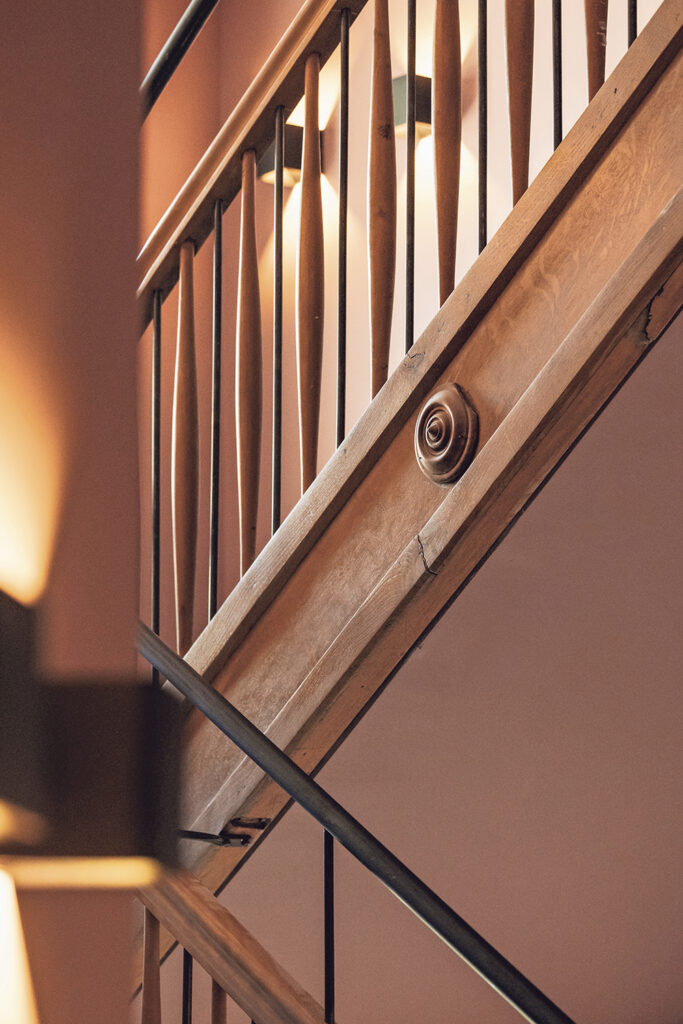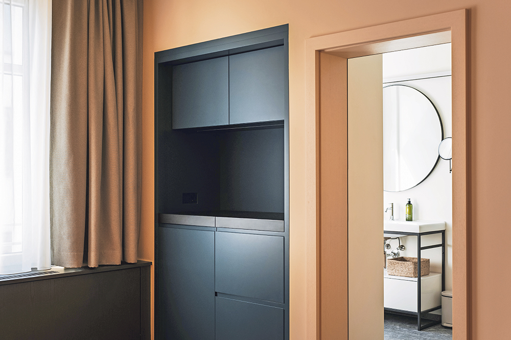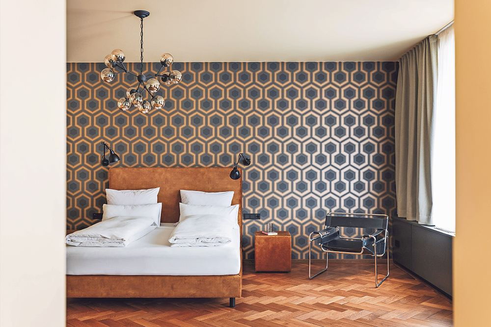 Martina Hladik entwickelte gemeinsam mit dem Team ein Interieur, das warme Materialien und klare Formen kombiniert: Eichenparkett, Vollholztüren, teilweise handgefertigte Möbel, Designerstoffe und Tapeten. Unterschiedliche Deckenhöhen, teils sichtbare Schieflagen und liebevoll gesetzte Details erzählen vom Charme des Altbaus. Die Bäder zeigen sich modern und großzügig, mit großflächigen Duschen und hochwertigen Armaturen. Zusätzlich ist in jedem Studio eine eigens entworfene Kücheneinheit integriert. Das Hotelkonzept folgt dem Trend zur digitalen Autonomie. Check-in und Check-out erfolgen per Code, ebenso die Türöffnung. Persönlicher Kontakt bleibt möglich, aber optional, etwa 10 Prozent der Gäste nutzen den Vor-Ort-Service, so Inhaber und Betreiber Andreas Karg.