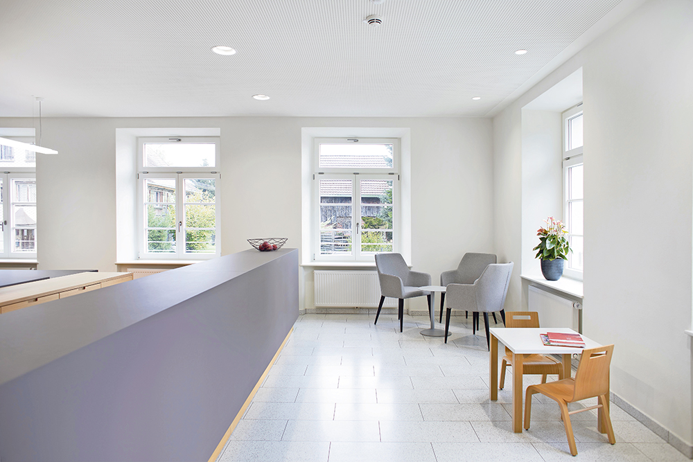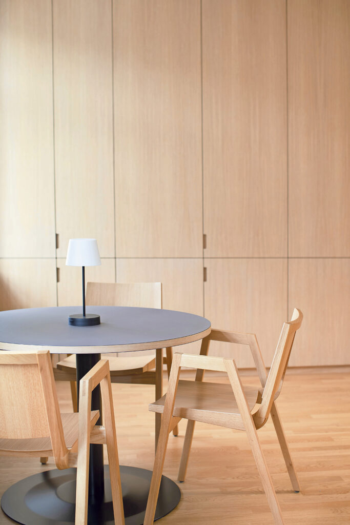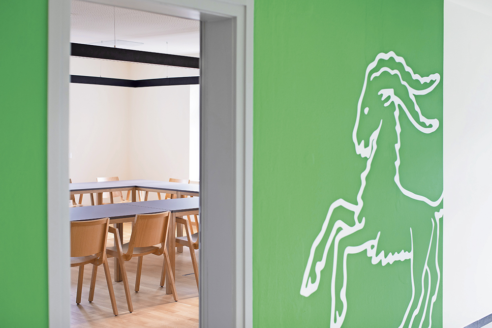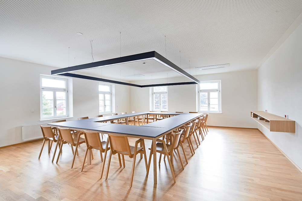 Abgehängte Decken ermöglichen die Integration von Klimageräten und einer zeitgemäßen Beleuchtung. In einzelnen Räumen – etwa im Sitzungssaal im ersten Stock – wurde die Decke geöffnet, Stahlträger wurden eingezogen und die Deckenhöhe des Raumes damit erhöht. Die neue Atmosphäre des Hauses ist geprägt von warmen Materialien und freundlicher Klarheit. Helle Holzoberflächen in Eiche, adaptierte Türzargen mit Brand- und Schalldämmung und gezielt eingesetzte Akustikelemente schaffen eine angenehme Arbeitsumgebung. Das Farbkonzept orientiert sich ruhig und einladend am Grün des Gemeindelogos. Eine klare und verständliche Beschriftung sorgt für eine konsequente visuelle Linie. Auch die Möblierung folgt einem nachhaltigen Ansatz: Die hochwertigen Möbel stammen von heimischen Handwerksbetrieben und passen sich in Farbe und Material dem Ambiente an, was dem Haus eine authentische Note verleiht.